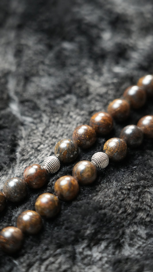 كل مسبحة تتكوّن من 33 خرزة بقياس 10 ملم، من أحجار طبيعية مختارة بعناية: عين النمر، البرونزيت، واللارفيكيت — لكل حجر عمقه ونقوشه الطبيعية الفريدة.
